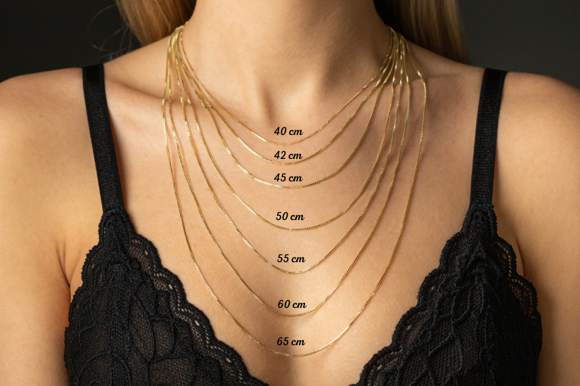 40–42 cm: tzv. choker, velmi těsně obepíná krk a je jako stvořený pro dámy se štíhlým krkem. Hodí se k šatům s odhalenými rameny, bez ramínek, s lodičkovým i hlubokým výstřihem. I v případě, že chcete opravdu velmi upnutý řetízek, doporučujeme k obvodu Vašeho krku připočítat 5 centimetrů, aby řetízek při nošení neškrtil.