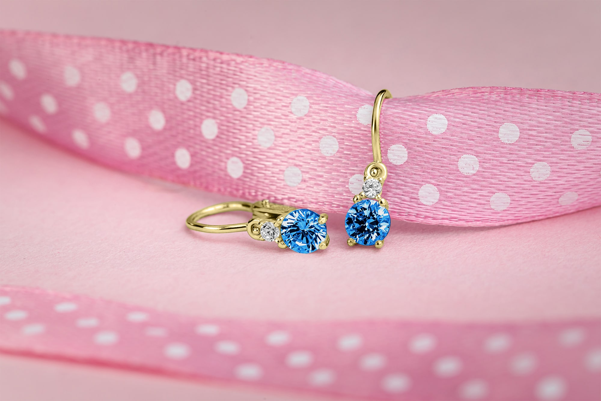 Ozdobte ouška svého miminka jemnými náušnicemi Enna. Žluté zlato ozvláštňuje zirkon v barvě safíru a drobnější čirý kamínek. Klasické dětské zapínání bezpečně drží a nasazení náušnic je díky němu velmi snadné. Jak se Vám líbí?