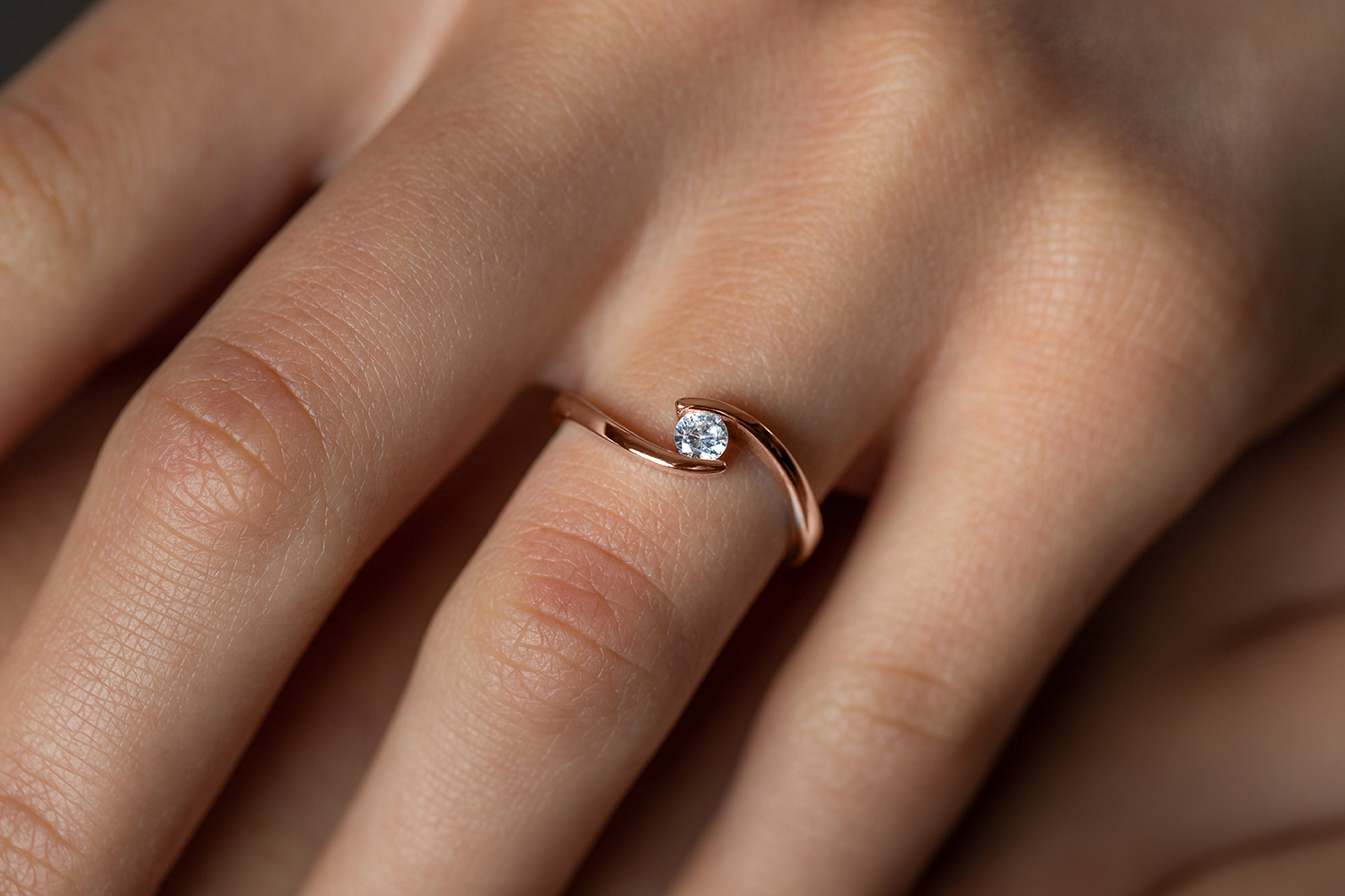 Zajímavě tvarovaný prstýnek z růžového zlata, který zdobí zářivý diamant briliantového brusu. Čisté oblé linie působí velice něžně a vkusně. Prstýnek se hodí pro žádost o ruku, jako dárek i jen tak pro radost. K tomuto šperku obdržíte certifikát pravosti.