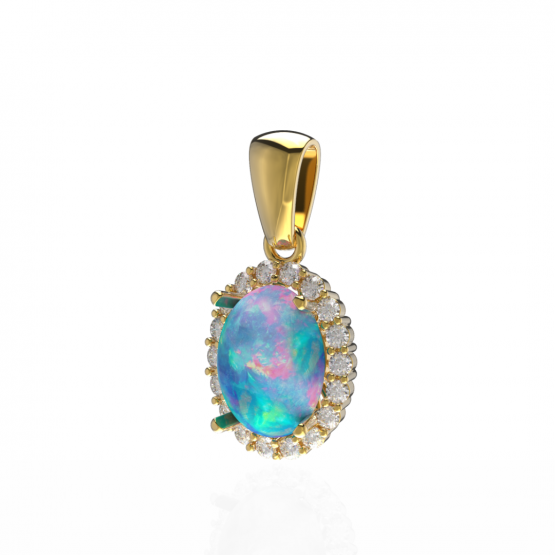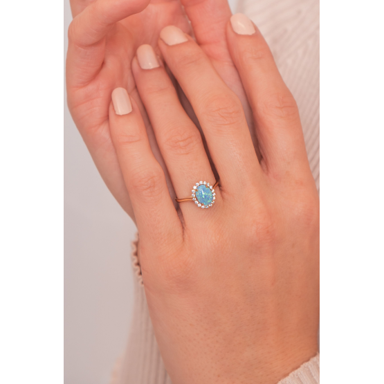 Popis produktu: Půvabný prsten Ophelia se syntetickým modrým opálem a zirkony, žluté zlato