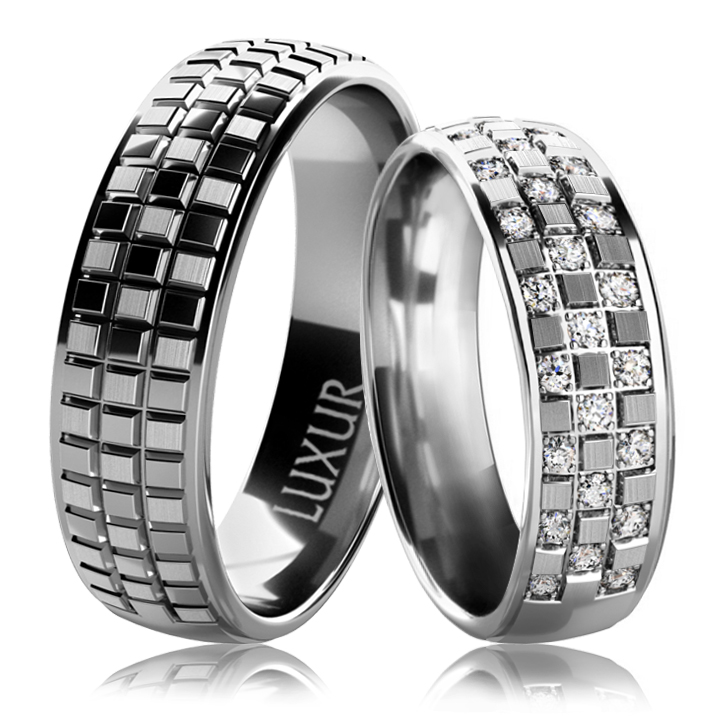 Neobyčejné snubní prsteny Barlandy pro neobyčejný pár. Celá obroučka je posetá efektními kostičkami a na prsteni pro ni se třpytí záplava jiskřivých kamenů. Prostě šperky pro ty, kteří se nebojí vyniknout.