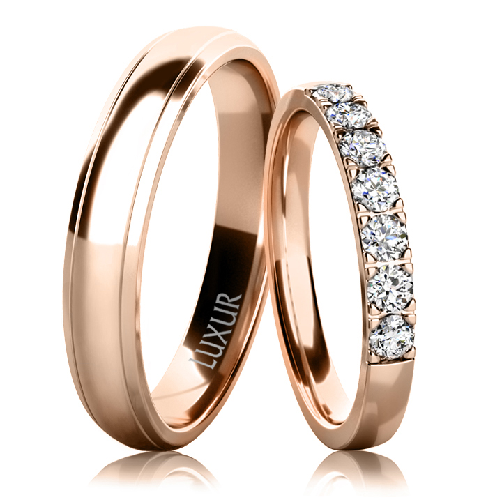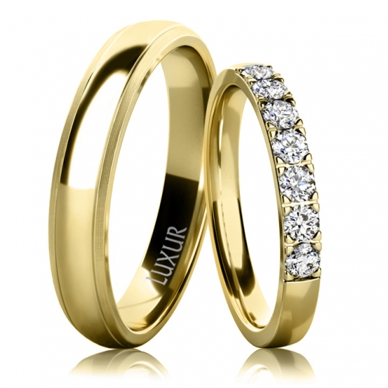 Snubní prsteny Dario jsou stvořené pro milovníky moderního designu. Pánský prsten s efektně sníženými okraji v sobě kombinuje lesklé zlato s matným. Dámský prsten z dokonale hladkého lesklého zlata může zdobit Vámi zvolený počet jiskřivých kamenů.