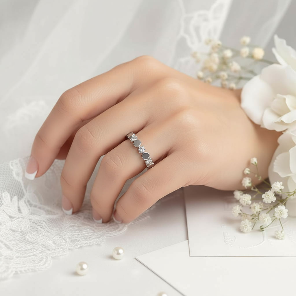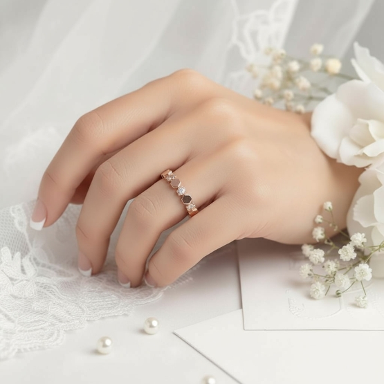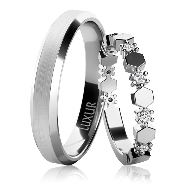 Snubní prsteny Dorien jsou jako žádné jiné. Pánský prsten má nápadně zkosené hrany, což mu dodává na atraktivitě. A dámský prsten je jako z pohádky. Rafinované šestiúhelníky se střídají s jiskřivými kameny a dávají tak vzniknout naprosto jedinečnému šperku. Prsteny pro Vás vytvoříme ze zlata, které nejvíce sedí Vašemu vkusu – vybrat si můžete z klasického žlutého, moderního bílého a romantického růžového.