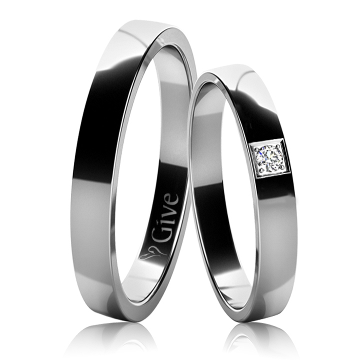 Snubní prsteny Skyler v čistém designu, se silnější obroučkou. Sami si zvolte barvu zlata (žluté, bílé, růžové) a jeho povrchovou úpravu (mat/lesk), šířku prstenů i počet kamenů, které budou zdobit prsten pro ni.