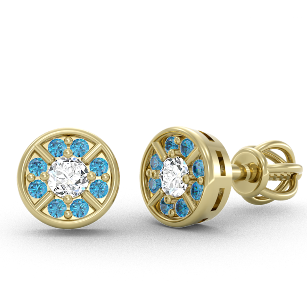 Popis produktu: Třpytivé peckové náušnice Adrianne, žluté zlato s modrými zirkony